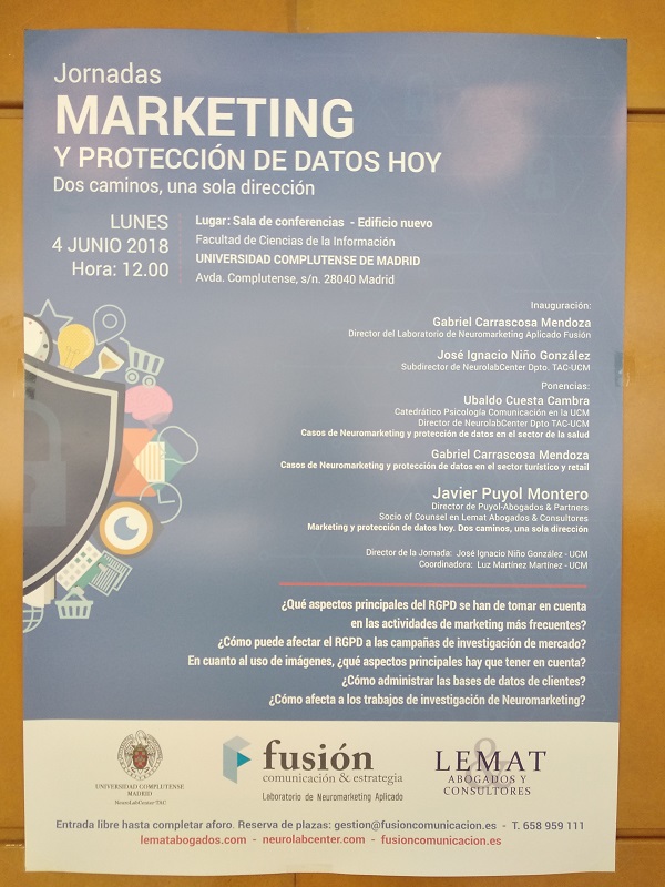 Gracias por invitarnos a Javier Puyol Montero, ponente principal, Jose Ignacio Niño, profesor de la UCM y subdirector de la Jornada, Gabriel Carrascosa, director de Fusión, comunicación y estrategia, Ubaldo Cuesta Cambra, Catedrático de la UCM y Juan Carlos Soler, partner del laboratorio Neuromarketing en Madrid.